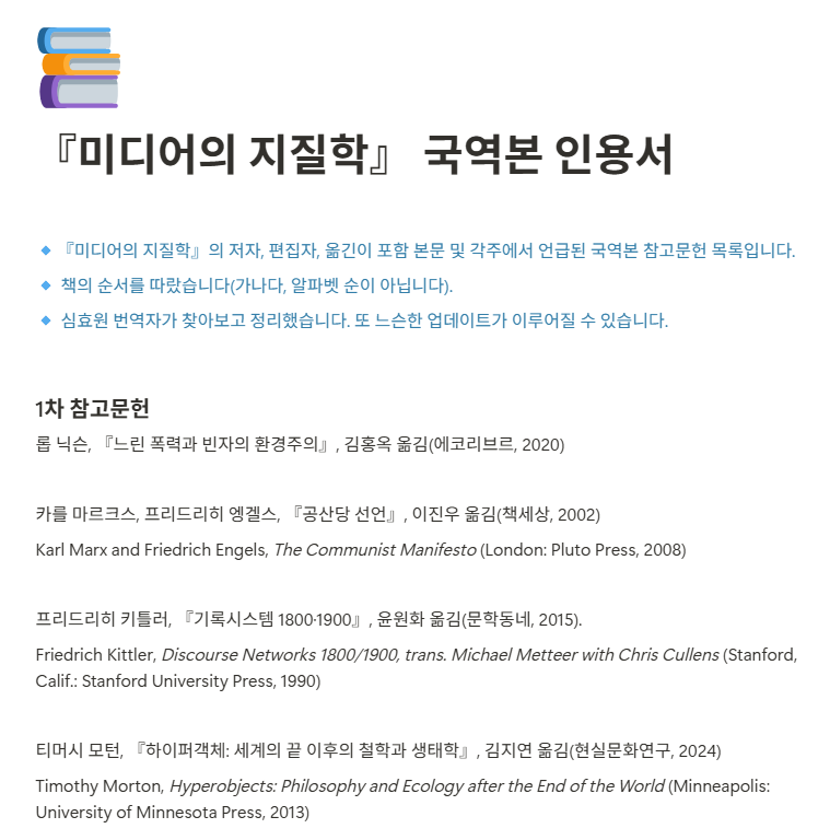 롭 닉슨의 용어를 받으려면 『느린 폭력과 빈자의 환경주의』를 만나야겠지요. 역자가 정리한 참고문헌 페이지에서 『미디어의 지질학』이 어떤 도서를 참고하고 교차하고 영향을 받는지 한 눈에 보실 수 있습니다.