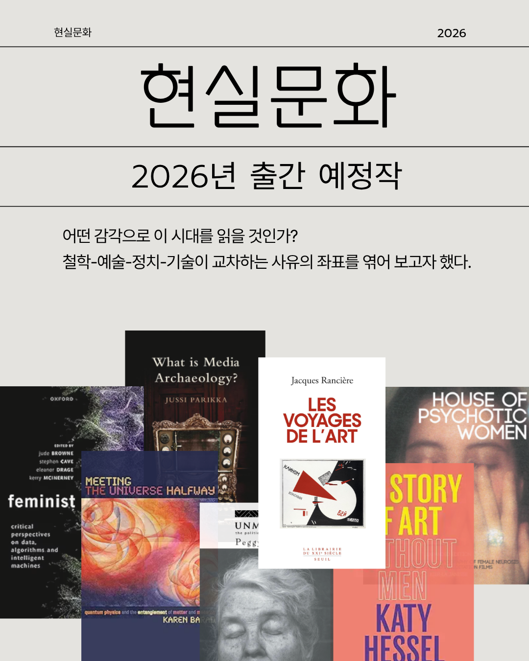 현실문화의 2026년 목표를 소개합니다. 철학-예술-정치-기술이 교차하는 사유의 좌표를 엮기 위한 7권의 목록을 준비했습니다. 이중 5권이 페미니즘 도서라는 반가운 소식도 함께 전합니다. 작년에 소개해 드린 <예술의 여행>과 <미디어고고학이란 무엇인가>를 제외하고 면면을 살펴보겠습니다.