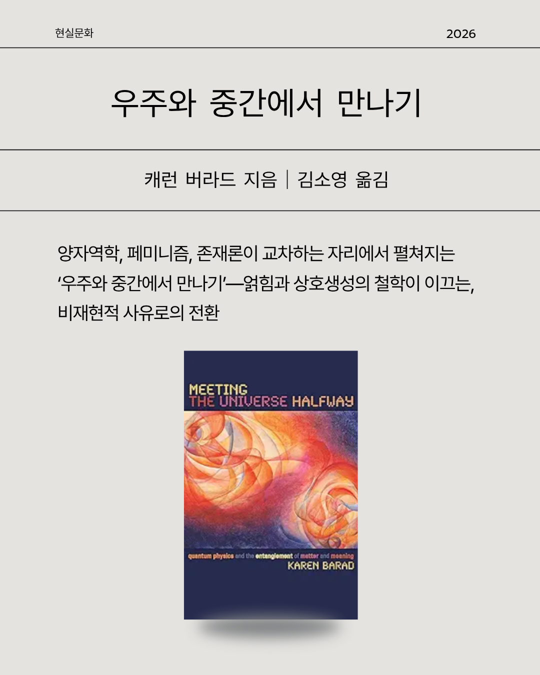 <우주 중간에서 만나기>는 양자역학, 페미니즘, 존재론이 교차하는 책입니다. '얽힘과 상호생성의 철학이 이끄는, 비재현적 사유'라는 문장에 이제 우리에게 익숙한 단어 '얽힘'을 발견합니다(<세계 끝의 버섯>). '세계 끝'에 이어 '우주의 중간'으로 나아가 봅니다.