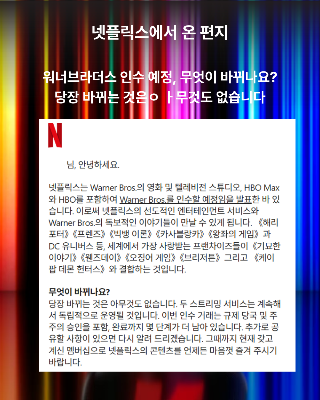 넷플릭스는 최근 워너 브라더스 인수 예정을 발표하면서 또 한번 큰 변화를 예상하게 하는 가운데, 일단 당장 변하는 것은 아무것도 없다는 편지를 보내기도 했습니다.