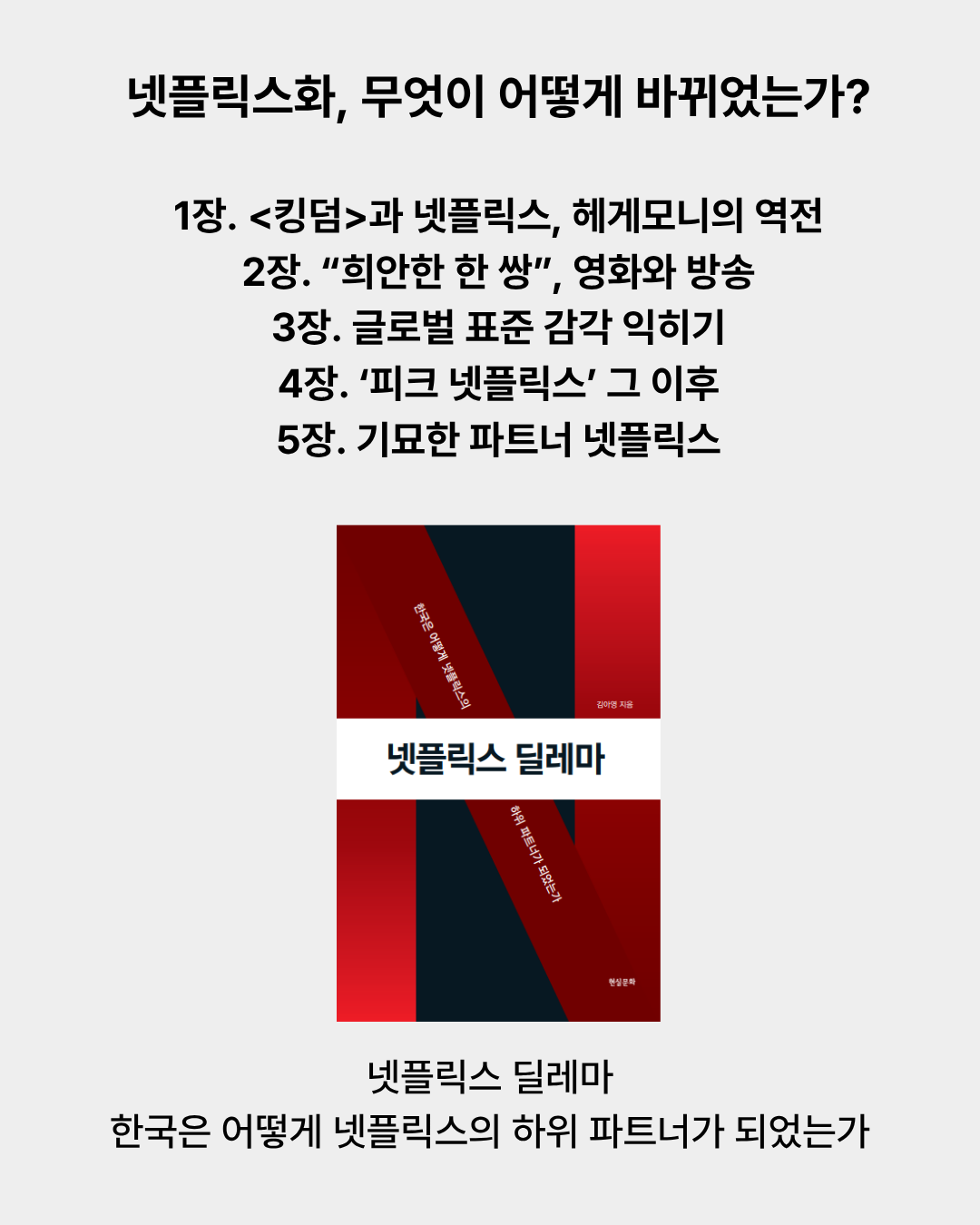 하지만 <넷플릭스 딜레마>를 보면 사정이 다릅니다. 한국이라는 무대에서 넷플릭스화로 무엇이 어떻게 바뀌었는지 살펴보세요. |